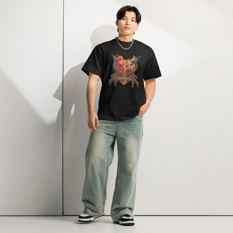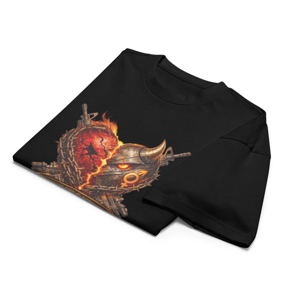 The design hits hard with a war-ready aesthetic: split hearts, fire, smoke, metallic elements, and raw symbolism layered into a bold, street-certified visual. It pulls from vintage battle imagery and modern streetwear culture, creating a look that feels dangerous, intentional, and impossible to ignore.