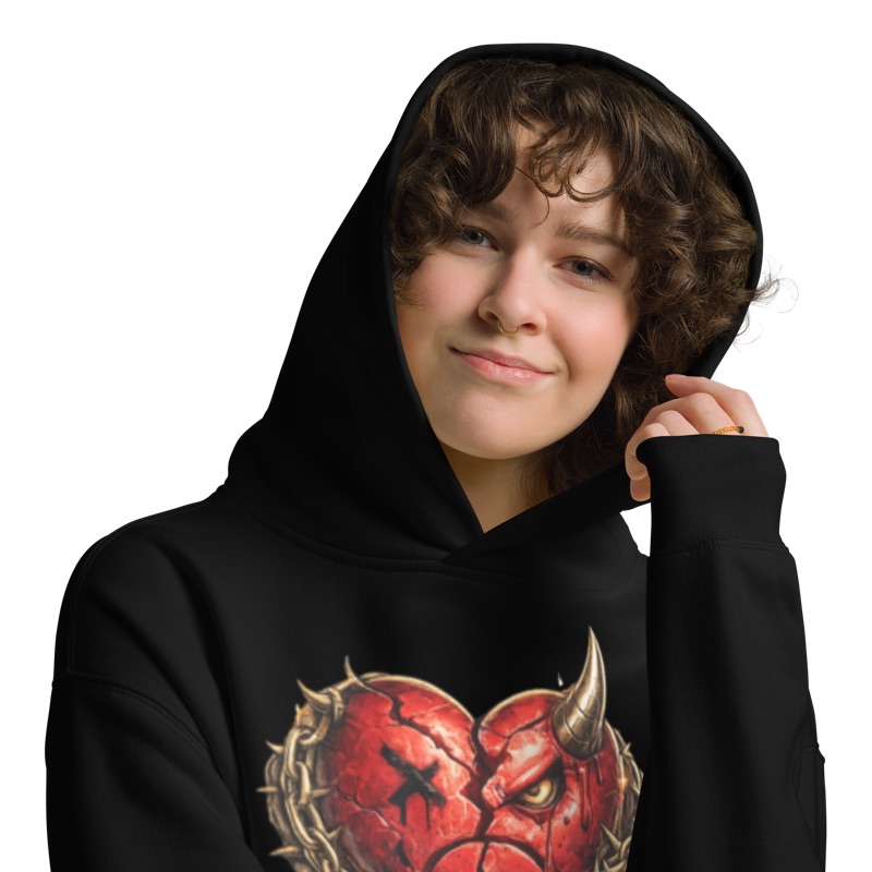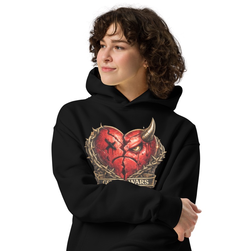 The design is fierce and unforgettable: a shattered heart with devilish horns, a blood tear streaking down its face, and jagged barbed accents. Wrapped in GENDER WARZ branding, the hoodie captures the tension between heartbreak and power, rebellion and style. Every detail screams streetwear luxe with an edge you can’t ignore.